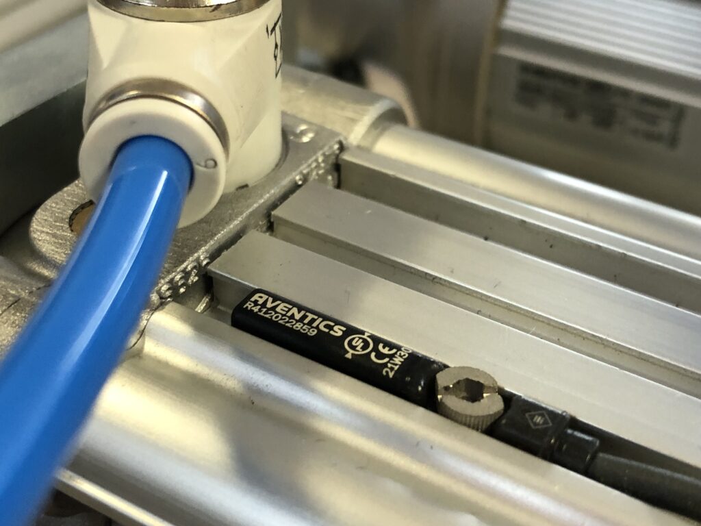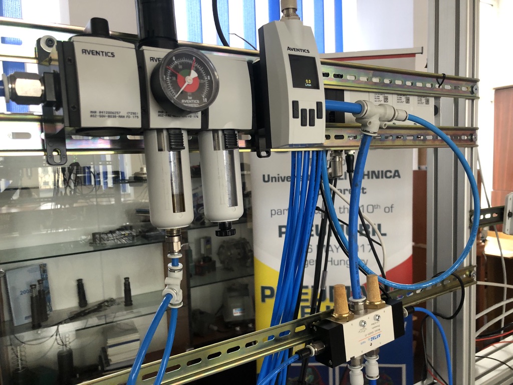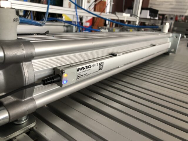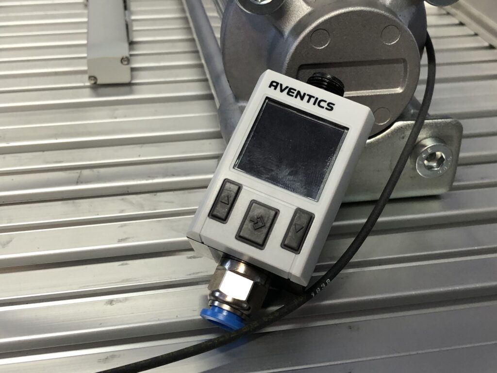 By far our most prized sensor has to be the Aventics AF2. In out configuration using the IO-Link variant it can measure air pressure, air flow and temperature, two at a time. In most of our configurations it is placed right after the air preparation Aventics AS5 unit.
